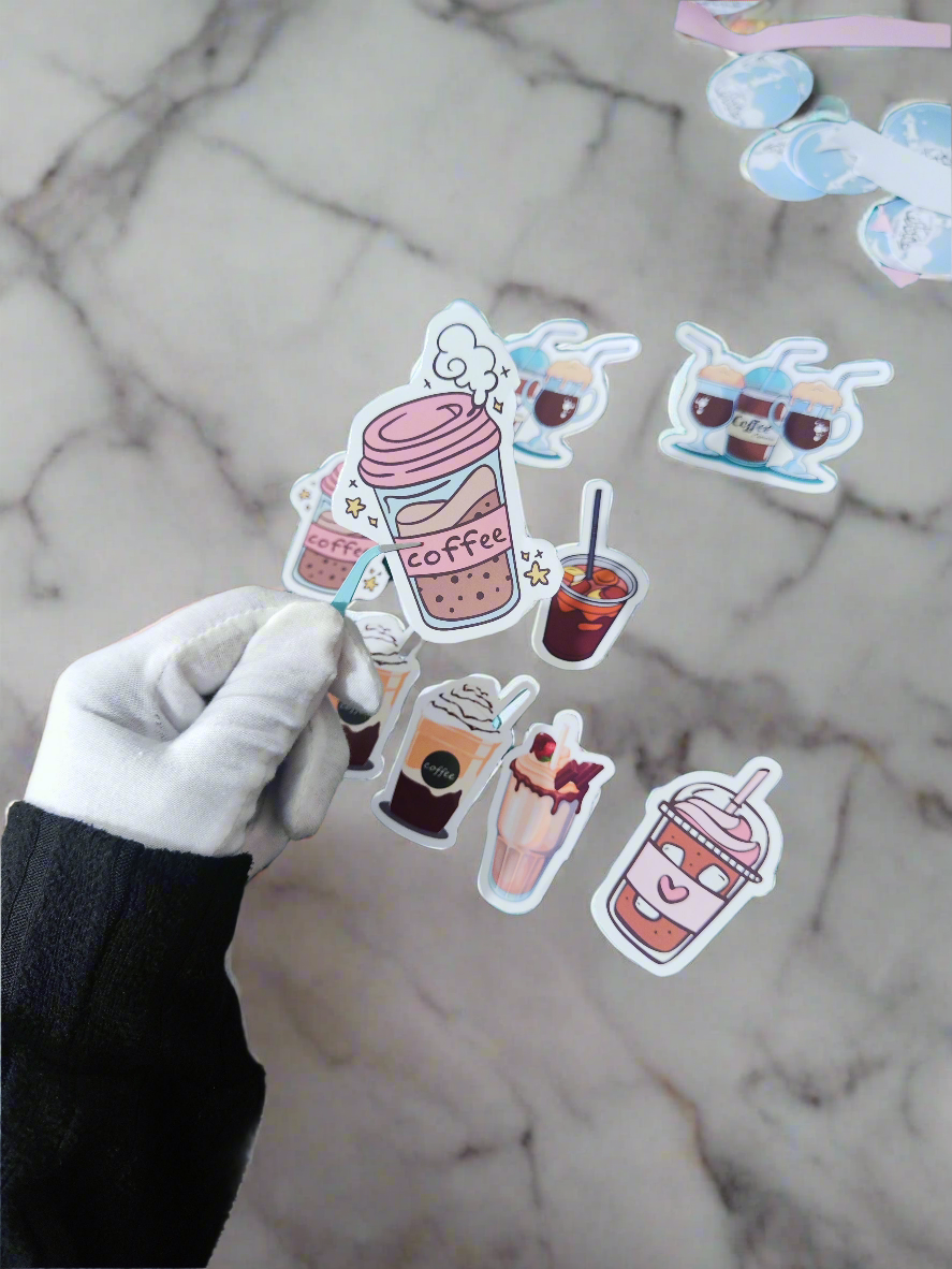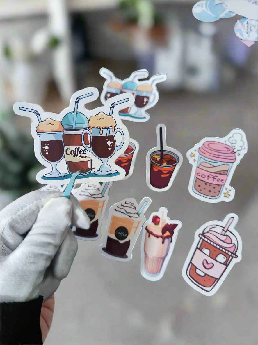 Uppgradera din stil med våra charmiga klistermärken med kaffe-tema! I detta paket får du 11 stycken unika och laminerade klistermärken, perfekta för att dekorera din laptop, anteckningsbok eller vad helst du vill.